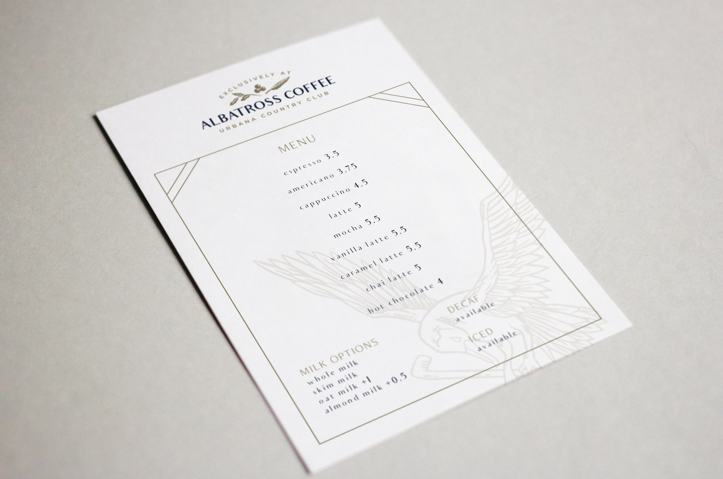 In 2022 the Urbana Country Club opened a members-only coffee space in their new Resort. I was hired to create a new visual identity for the space. The branding was developed over a period of many months, and involved many conversations about the strategy behind the brand with the GM and Owner. The central goal for the brand was to present to the members a brand that is both edgy and luxurious, welcoming and elevated. From the illustrative icon of the albatross to the subtly elegant type, the merging of the old and the new is what we wanted to convey in the branding as a whole.